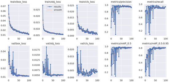 The term train box loss shown in Figure 5 typically refers to the loss function associated with the bounding box predictions during the training of an object detection model using YOLOv5. This loss function is crucial in guiding the model to learn how to accurately predict the locations of objects within an image. As shown during training, the value decreases with an increasing number of epochs, which means that the model is learning to predict bounding box coordinates accurately and assign appropriate confidence scores. Generally, when the model’s predictions align closely with the ground truth annotations in the training data, the box loss decreases. Typically, the phrase Train obj loss refers to the object loss that occurs during the training of an object detection model. This loss function is crucial in helping the model identify the proper items in the image. Classification loss and object loss are two of this function’s main components. As is apparent, this function decrements with epochs, which is in line with the training goal. By reducing this loss, the model is better able to categorize objects inside its bounding boxes. The object loss minimizes as the model’s predictions move closer to the ground truth class labels and the object ratings in the training data.