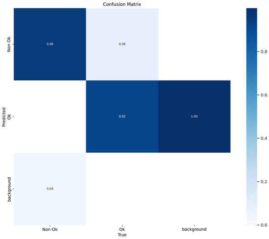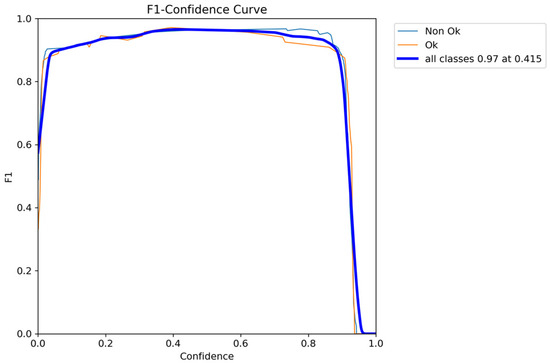 Figure 6 presents the confusion matrix which is especially useful for understanding how well the model performs in terms of True Positives, False Positives, True Negatives, and False Negatives. Figure 7 depicts F1 versus confidence performance for the defective and non-defective dataset. Typically, it shows how the F1 score, a standard assessment metric for object identification, evolves as confidence levels are changed. This sort of graph provides useful information on the trade-off between accuracy and recall in an object detection model at various confidence levels. It enables us to make informed decisions regarding the trade-off between accuracy and recall, maximizing the performance of your object detection model for your unique job or application. As illustrated, the optimal F1 score is obtained with a confidence level of 0.415.