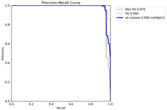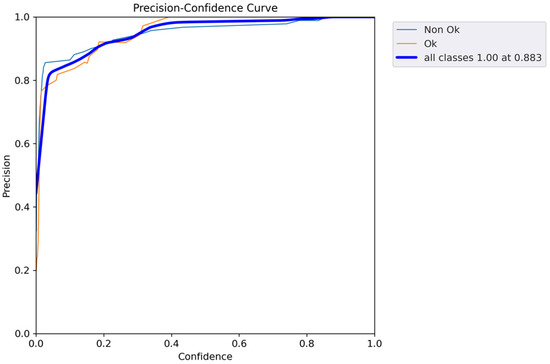 Figure 8 shows how the performance curve changes for precision versus confidence. As shown, the curve typically starts high and increases until it reaches 1, at the confidence of 0.883. In addition, Figure 9 provides an insight into how well YOLOv5 balances the trade-off between precision and recall across different confidence thresholds. In YOLOv5, as in many object detection models, precision represents the accuracy of positive predictions, and recall measures the model’s ability to detect all the true positive objects.