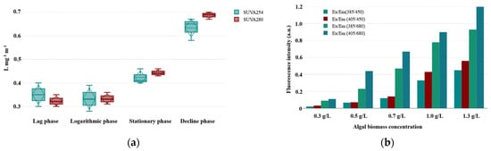 (a) Whisker and box plot of AOM in different growth phases. This figure represents the absorbance at SUVA254 and SUVA280 (n = 6). (b) Fluorescence intensity from the 3D EEMs at varying algal biomass concentrations.
