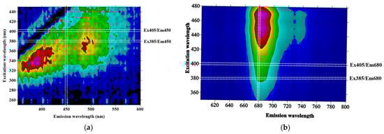 Fluorescence EEMs of Chlorella sp. at 0.3 g/L. (a) Algal organic matter EEM showing Ex/Em 405 nm/450 nm and Ex/Em 385 nm/450 nm. (b) Chlorophyll-a pigment EEM showing Ex/Em 405 nm/680 nm and Ex/Em 385 nm/680 nm.