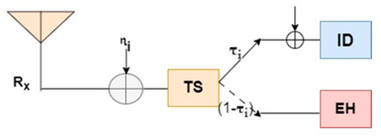 where Pt is the transmit power, x is the data symbol with unity power, i.e., where E[] is the mathematical expectation, ~ CN (0, σ2) is the channel noise, = d−m represents the path loss, d is the distance between the source and the destination nodes, and m represents the pathloss exponent. The achievable rate ℜ of the system based on the TS scheme is provided in Equation (2) and is as follows: