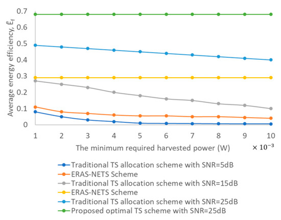 In Figure 3, as the distance increases, the average energy efficiency decreases. In the intermediate regions where SNR = 15 dB and 25 dB, the gap between the traditional scheme and the proposed scheme becomes obvious due to the saturation characteristic of the EH model. In Figure 4, as the minimum required harvested power increases, the average energy efficiency of the traditional scheme decreases, whereas it remains unchanged with the proposed scheme.