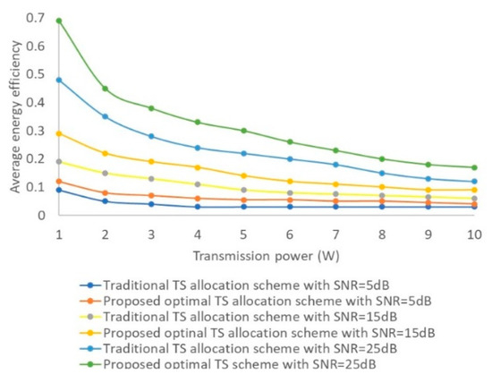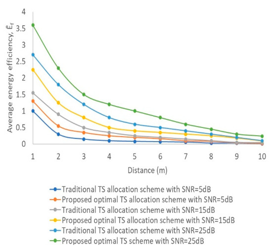 In this section, simulation results for the proposed optimal resource allocation scheme are presented. In each time slot k, the channel obeys the Rayleigh distribution. The distance between the source node and the destination node is d = 5 m, and the pathloss exponent m = 2.0, and. The power transmitted, Pt = 1 W, m = 5 mW, Pm = 24 mW, Hth = . The energy efficiency with various SNR [5,15] is analyzed for different values of transmission power . For verification purposes, the proposed resource allocation scheme is compared with [16] in terms of the energy efficiency () of a system that is defined as the ratio of the total achievable rate to the total power consumption as described in Equation (17). Hence, the average energy efficiency f is provided by Equation (18).
