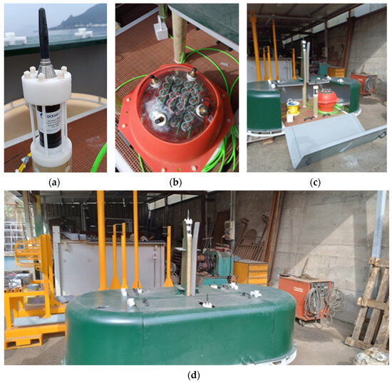 Panarea acoustic station during the mechanical assembly phase: (a) the commercial hydrophone forming the array, (b) the battery pack, (c) the IPANEMA station with the open deck, and (d) the IPANEMA station with the closed deck where the four hydrophones are shown.
