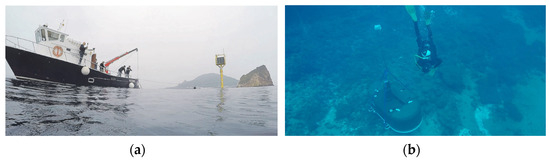 Panarea acoustic station during its first deployment: (a) a crane boat submerging the station in water; and (b) a submerged diver releasing the station from the crane.