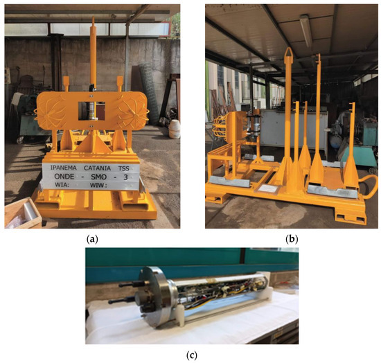 The Panarea shallow water site will be acoustically monitored by an array of four large-bandwidth hydrophones (model Ocean Sonics IcListen Smart Hydrophone) fed by a battery pack. In order to locate CO2 emissions acoustically, the four hydrophones are time-synchronized. Time synchronization has been obtained by using the internal clock of one of the acoustic sensors as a master clock for the other sensors. Synchronization was tested and verified during tests on the dry bench. From considerations on the internal memory capacity of the hydrophones (497 GB), on the electrical consumption of the sensor, and on the energy capacity of the battery pack (408 Ah), a data-taking mode that provides 6-min recordings every hour was set. For the first measurement campaign, acoustic data are acquired with a sampling frequency of 128 kHz. This choice guarantees the acoustic monitoring of the study area for about 6 months. Given the shallow depth at which the Panarea station is located, it was deemed necessary to create a protective structure to safeguard the instrumentation from wave and atmospheric phenomena and from fishing activities. This structure, designed at the INFN-LNS, consists of a fixed part to be anchored to the seabed and a removable part that houses the sensors and battery pack and will be cyclically replaced at the end of each data collection period. The battery pack that powers the hydrophones is placed inside a bentosphere that has been subjected to a vacuum leak test. The hydrophones are fixed on supports whose respective distances are 1 m (see Figure 2).
