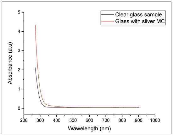 An experiment was conducted to measure the absorption of glass samples that underwent Low-Temperature Ion Exchange (LTIE), as well as transparent glass samples that were not subjected to LTIE treatment. The resulting spectrum is depicted in Figure 3. Notably, the absorption spectrum of the samples after the LTIE process lacks characteristic absorption peaks. This absence is attributed to the fact that, under the same process parameters used in the treatment, predominantly silver molecular clusters, such as Ag2...5, are formed [].