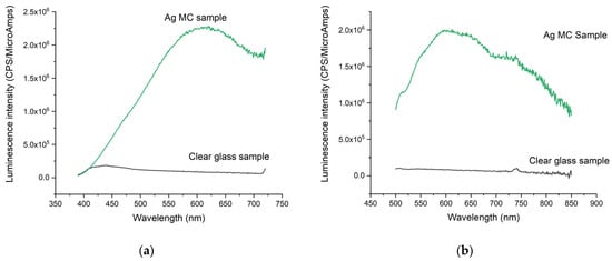 Figure 4 presents the results of measuring the luminescence intensity. When excited at wavelengths of 370 nm and 390 nm, the luminescence spectra of all synthesized glasses exhibit a broad luminescence band within the visible spectrum. This broadband luminescence spanning from 500 to 900 nm corresponds to the emission emanating from a small quantity of silver microcrystals formed directly during the LTIE process []. To generate molecular clusters (MC), it is imperative to reduce silver ions to their atomic state. This transformation leads to the creation of a certain quantity of silver microcrystals during the LTIE process, consequently giving rise to weak luminescence across the entire visible range.