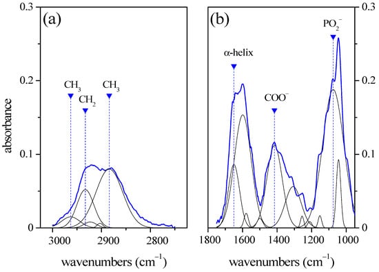 | α-helix (1642–1661 cm−1); C=O stretching of proteins (Amide I band) | 35 | 27 ± 5 | 1644 ± 7 | 12 | 4 ± 4 | 1650 ± 8 |