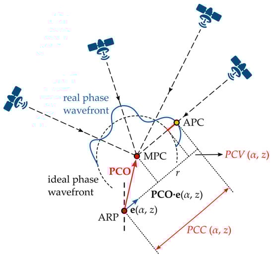 where is the line-of-sight unit vector from the receiver to the satellite i, and is the constant part equal in all directions present due to the relative characteristics of GNSS measurements [,]. The PCO is a vector from the antenna reference point (ARP) to an arbitrarily defined mean phase center (MPC). The PCV is the direction-dependent range correction function, i.e., the difference between the real and ideal phase wavefront. The PCCs, and all corresponding antenna-related points, vectors, and scalars, are defined in a 3D antenna-fixed left-handed coordinate system (antenna frame–AF).