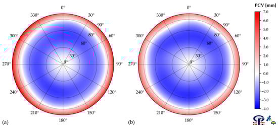 To obtain a quantitative accuracy estimation of LMMT calibration results, the following scalar measures of the PCC difference pattern are calculated: minimum and maximum , root-mean-square (RMS) deviation of , range of the , and the interquartile range (IQR) of the . All calculated values are given in Table 2. Furthermore, because during the majority of GNSS applications, a standard elevation mask of a minimum of 10° is used, a 10° elevation-reduced antenna hemisphere analysis is justified. All accuracy measures were determined accordingly and are given in Table 2.