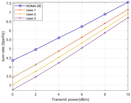Figure 2 compares the sum rate of NOMA-DE with random PA. The sum rate improves as the transmit power increases. For the analysis, a transmit power of is considered, and the corresponding sum rate values are given in Table 2. At , transmit power, NOMA-DE achieves a sum rate of , and using random PA, case-1 achieves , case-2 achieves , and case-3 achieves . NOMA-DE surpasses random PA for the demands of sum rate. The sum rates of NOMA-DE,, and , are higher than random PA in case 1, 2, and 3, respectively.