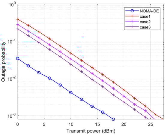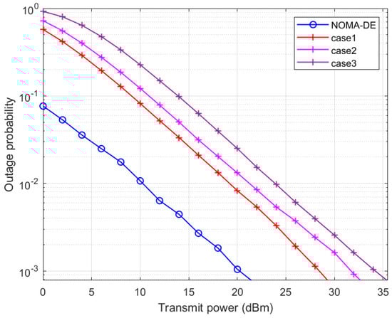 The outage probability comparison of NOMA-DE with random PA for user-2 is shown in Figure 4. The outage probability can be minimized by increasing the transmit power. User-2 achieves a desired outage probability of at transmit power under NOMA-DE, whereas under random PA with case-1 achieved the same value at , with case-2 at , and with case 3 at . NOMA-DE requires ,, and less power than random PA in case 1, 2, and 3, respectively. The transmit power values to achieve the desired outage and the corresponding difference between the different cases are given in Table 3.