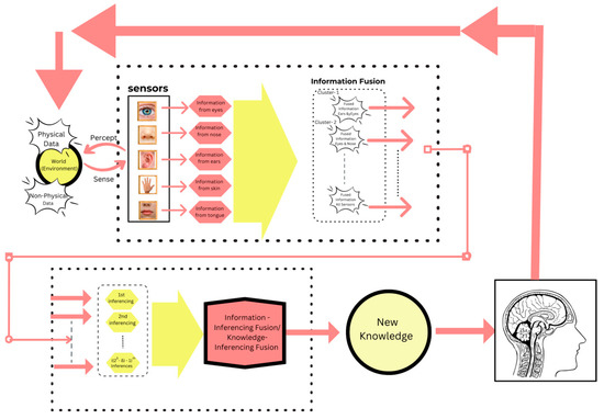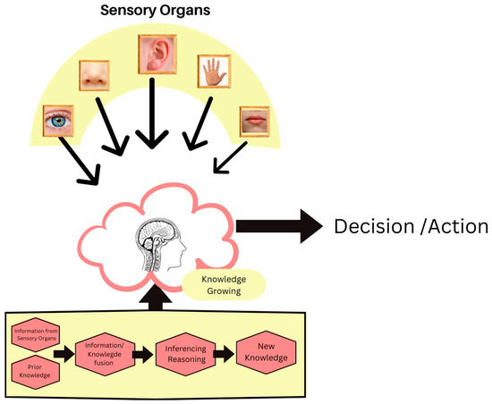 The human information fusion system (see Figure 2) is a constant and integral part of daily life. This system continuously processes incoming information, allowing individuals to make informed decisions. By amalgamating data from various sensory inputs, humans can comprehend their surroundings and respond appropriately to different situations. Moreover, this fusion of information not only enhances knowledge, but also shapes the way people interact with the world around them, influencing their perceptions and actions in a profound manner. Thus, the intricate process of information fusion lies at the core of human cognition, enabling individuals to navigate through life’s complexities with a greater understanding of their environment.