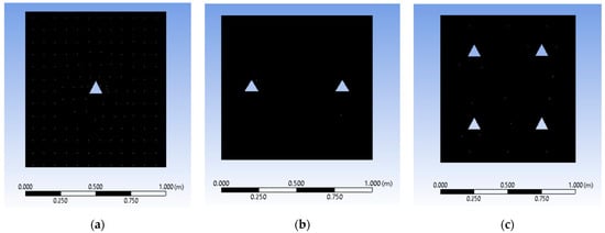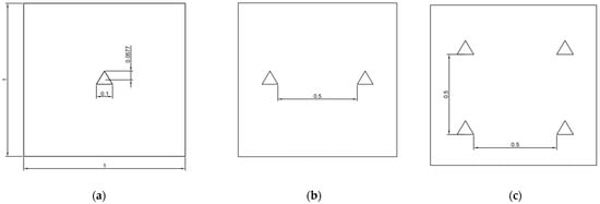 The geometry of a lid-driven cavity having (a) one, (b) two, and (c) four triangular blocks.