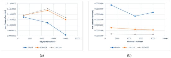 (a) Maximum and (b) Minimum component of stream function vs. Reynolds number for various grid sizes.