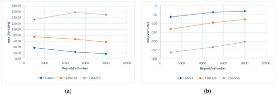 The numerical results demonstrated regarding streamlines, vorticity, and kinetic energy for specific Reynolds numbers are shown in Figure 3, Figure 4 and Figure 5, respectively. For more accurate results, various grid sizes of 642, 1282, and 2562 were used for each Reynolds number (1000, 5000, and 8000, respectively). A personal computer with an Intel Core i5-8300H processor and a CPU that is rated at a clock speed of 2.3 GHz was used to conduct the numerical simulations. The model was validated by comparing the velocity extrema along the centerlines generated by Souayeh [], Cazemier et al. [], and Gouillart and Thiffeault [] for Re = 1000. These results are enumerated in Table 3, and it is seen that these results show reasonable proximity to the existing literature.