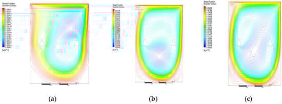 Streamlines for Reynolds numbers of (a) 1000, (b) 5000, and (c) 8000 for the grid size of 2562 for a cavity with two obstacles.