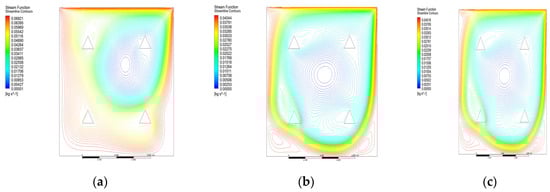 Streamlines for Reynolds numbers of (a) 1000, (b) 5000, and (c) 8000 for the grid size of 2562 for a cavity with four obstacles.