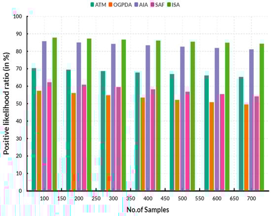 Figure 3 shows the comparison of the negative likelihood ratio. In a comparison, the proposed ISA reached an 87.08% negative likelihood ratio. The existing ATM obtained 62.72%, OGPDA reached 52.46%, AIA obtained 85.17% and SAF obtained 61.47% negative likelihood ratios.
