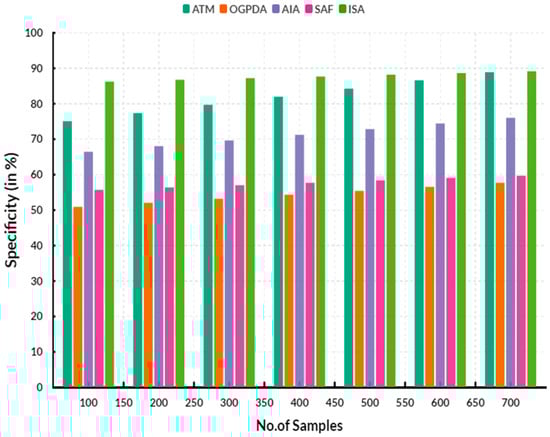 Figure 4 shows the comparison of specificity. In a comparison, the proposed ISA reached 87.71% specificity. The existing ATM obtained 81.98%, OGPDA reached 54.33%, AIA obtained 71.26% and SAF obtained 57.73% specificity.