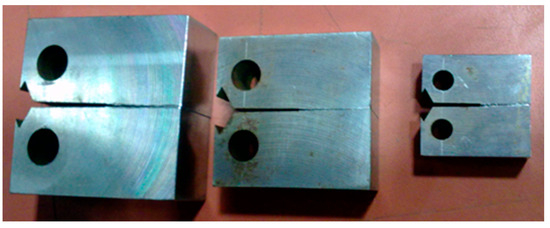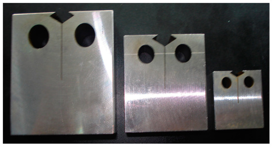 Assuming an approximate value of fracture toughness of 50 MPa for AISI-4140 steel [11,15] and using the modulus of elasticity (E), 0.2% yield strength (Sy), determined from the monotonic test [16], the minimum thickness of the C(T) specimen required is determined with the help of Equation (1). To confirm that the fracture toughness values obtained correspond to the plane-strain condition, five specimens of thicknesses of 12.5 mm, 20 mm, and 25 mm are considered based on the available dimensions of the mounting fixture. All the C(T) specimens of the L-R type are machined from the round bar. The initial crack length provided in each specimen corresponds to a/W of 0.44 to 0.46. Table 2 shows the major dimensions of the C(T) specimen used for AISI-4140 steel, and Figure 2 shows the image of these three specimens.
