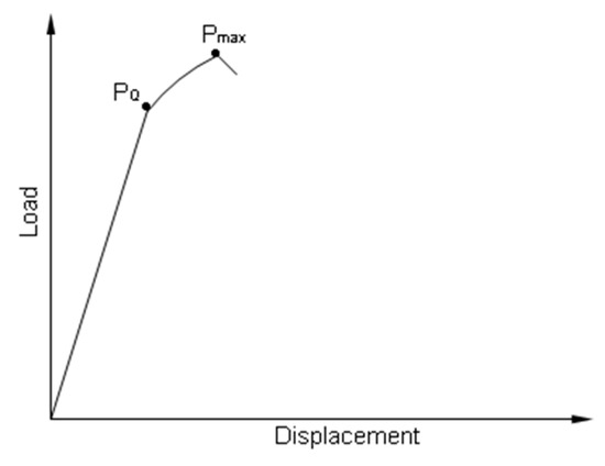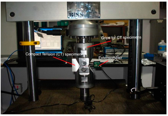 A crack was initiated on the testing plane using a fatigue load at 10 Hz in the region of a pre-existing cut that was introduced in the specimen via wire-cut EDM [17]. Initial cracking is performed for about 0.5 to 1 mm in constant loading and at a very low positive stress ratio R. Later, the pre-cracking is extended until a/W reaches values of 0.5 to 0.51 at R = 0.3, to reduce the test’s duration. Further, the specimen is subjected to tensile loading at 0.55 to 2.75 MPa, and a record of load vs. displacement is noted. The maximum load corresponding to the linear portion of the load–displacement curve is noted as PQ and the maximum load recorded is Pmax, as shown in Figure 4. Corresponding to these two values of forces, stress intensity factors KQ and Kmax are determined using the expression of stress intensity factor and the geometry constant for the C(T) specimen. If Pmax/PQ ≤ 1.1, then KQ is considered as the fracture toughness of the material [11]. If not, the test is declared invalid.