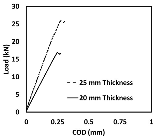 Initial pre-cracking was carried out via fatigue loading, as explained above, and the fracture toughness values were obtained via tensile loading. The load–displacement curve obtained during the test is shown in Figure 5. The fracture toughness test was not a failure for both the 20 mm and 25 mm thickness specimens, as shown in Table 3.