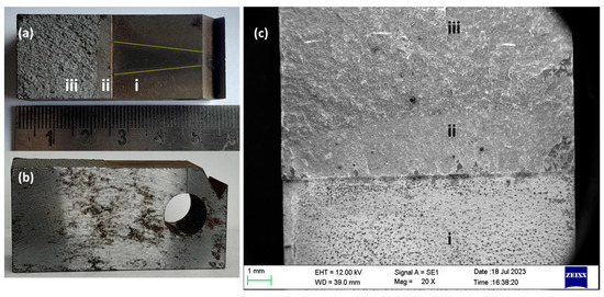 (a,b) Top and side view of the fractured specimen; (c) SEM image taken at 20× showing distinct regions over the failed surface. The specimen is divided into three zones, namely i, ii, and iii, as shown in figure (a,c).