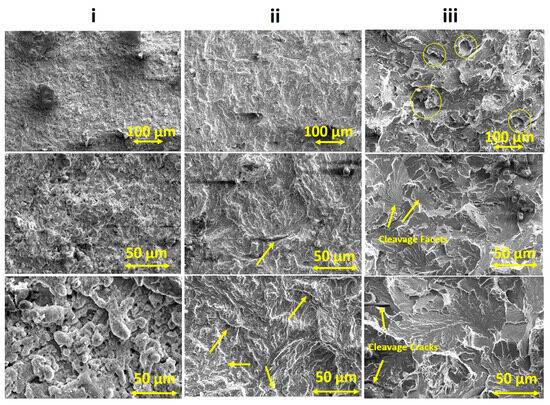 SEM images showing the observed surface features in different zones of the tested specimen. The specimen is divided into three zones, namely i, ii, and iii and represented the respective zone images in column format. The first row of images is taken at 500× magnification; the second- and third-row images are taken at 1500× and 3000× magnifications.