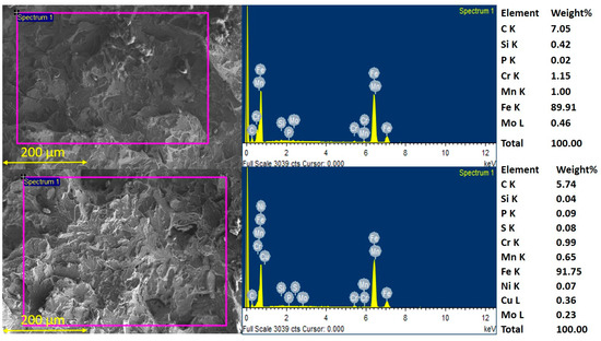 Energy dispersive spectroscopy (EDS) analyses were used to detect and quantify elements present in the fractured regions of the AISI-4140 specimens. The findings from this EDS analysis have been reported in the tables provided on the right of each EDS analysis image in Figure 9.