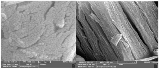 The morphology of the nano zinc oxide prepared by the hydrothermal method was further investigated using Field Emission Scanning Electron Microscopy (FESEM). The images shown in Figure 3 reveal zinc oxide in small white spherical shapes that are closely packed with one another. This structural evidence supports the formation of zinc oxide nanoparticles with different nanoscale dimensions, specifically at 1 m and 200 nm scales [17].