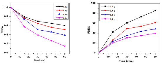 Determining the optimal quantity of catalyst is a crucial stage in scaling up the photocatalytic process, as it influences both the economics of the method and the downstream processing required to separate the photocatalyst from the reaction medium. The effect of ZnO NPs on the degradation of dye was studied within the range of 0.2–0.6 g under various optimal conditions. Figure 4 illustrates the influence of the catalyst’s mass on decolorization efficiency. As the weight of ZnO NPs increased from 0.2 to 0.6 g, the PhotoDegradation Efficiency (PDE%) improved from 39.56% to 89.71% after 1 h [18,19,20].