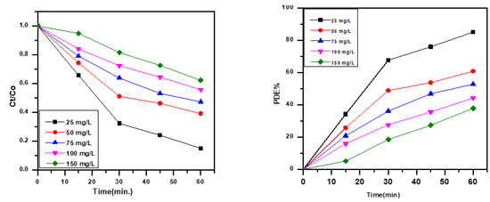 where is the initial concentration of the dye at the start of the test, and is the dye concentration after a given period of testing (t) [15].