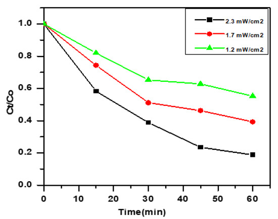 The influence of light intensity, ranging from 1.2 to 2.3 mw/cm2, was studied by altering the distance between the light source and the exposed surface of the material. The photodegradation of MB dye under the effect of varying light intensities was investigated using 0.4 g of ZnO NPs and a concentration of MB dye at 50 mg/L. As shown in Figure 6, it was determined that the reactions consistently follow first-order kinetics. The rate of photocatalytic degradation and PhotoDegradation Efficiency (PDE%) increased with rising UV light intensity. More radiation is available to excite the catalyst in this scenario, and thus, additional charge carriers are generated, leading to an elevated rate of photocatalytic removal [18].