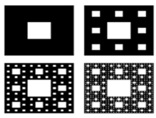 Sierpinski carpet geometry has a rectangular initiator, and in order to make the 1st iteration, the initiator is divided into nine equal squares. The middle one is eliminated, and the rest are all united. Likewise, we can generate higher-order iterations. Figure 1 shows four iterations; i.e., the 1st, 2nd, 3rd, and 4th iterations of a Sierpinski fractal geometry.