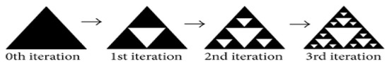 Sierpinski gasket geometry is a triangular fractal in which the initiator is a triangle. For the first iteration, divide the initiator into 4 equilateral triangles and subtract the middle one. For the 2nd iteration, make the remaining triangles into 4 equilateral triangles each and subtract the middle ones. Figure 2 shows the initiator and up to the 3rd iteration of the gasket antenna.