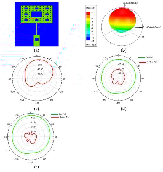 (a) Designed Sierpinski carpet fractal antenna in Ansys-HFSS; (b) gain plot; (c) radiation pattern; (d) co- and cross-polarization of Sierpinski carpet without a slot on the feed; and (e) co- and cross-polarization of Sierpinski carpet with a slot on the feed.