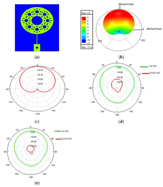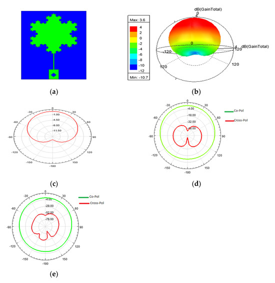 (a) Designed circular fractal antenna in Ansys-HFSS; (b) gain plot; (c) radiation pattern; (d) co-and cross-polarization of circular fractal antenna without a slot on the feed; and (e) co- and cross-polarization of circular fractal antenna with a slot on the feed line.