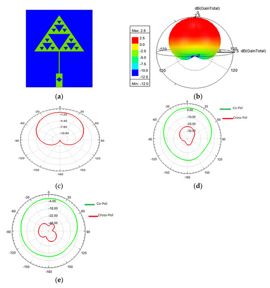 (a) Designed Sierpinski gasket fractal antenna in Ansys-HFSS; (b) gain plot; (c) radiation pattern; (d) co- and cross-polarization of Sierpinski gasket antenna without a slot on the feed; and (e) co- and cross-polarization of Sierpinski gasket antenna with a slot on the feed line.