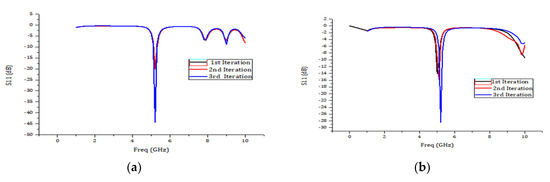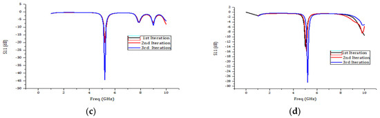 (a) Combined S11 plot of all three iterations of Koch fractal antenna; and (b) combined S11 plot of all three iterations of Sierpinski gasket antenna. (c) Combined S11 plot of all three iterations of circular fractal antenna; and (d) combined S11 plot of all three iterations of Sierpinski carpet antenna.