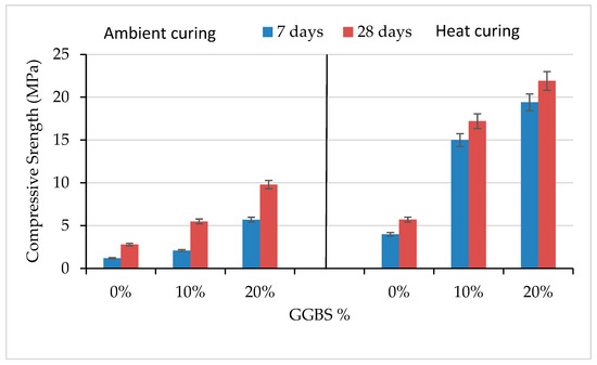 From Figure 3 it can be easily observed that, on average, heat curing a specimen delivers more compressive strength in comparison to ambient curing. This is because with an increase in temperature, the degree of geopolymerization also increases, thus giving a higher amount of reaction product [19]. Here, the heat curing delivers 233.33% and 103.92% more compressive strength in comparison to ambient curing at 7 and 28 days for control mix C100. It can be observed that heat curing causes more rapid strength gain in comparison to ambient curing. From the results, we can notice that in ambient curing the gains in compressive strength from 7 days to 28 days for mixes C100, C90G10, and C80G20 are 133.33%, 161.9%, and 71.9%, respectively, whereas in heat curing the gains in compressive strength from 7 days to 28 days for C100, C90G10, and C80G20 are 42.7%, 14.6%, and 12.8%, respectively. In short, the strength gain rate at an early age is higher in heat curing compared to ambient curing [20]. For the other mixes, C90G10 and C80G20, at 7 days heat curing results in 614.28% and 212.72 more strength, whereas at 28 days this % increase is somewhat less, i.e., 240.35% and 123.46%, respectively.