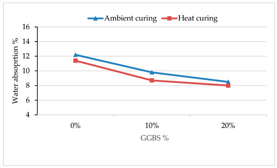 The water absorption of geopolymer mortar was assessed at 28 days of curing and the results are represented in Figure 4. From the results, it can be seen that by increasing the GGBS content the water absorption decreases in both ambient curing and heat curing; however, heat curing results in comparatively less water absorption. For ambient curing, the C90G10 and C80G20 mixes, respectively, result in 19.6% and 30.3% less water absorption in comparison to control mix C100. Similarly, for heat curing the C90G10 and C80G20 mixes, respectively, result in 23.6% and 29.8% less water absorption in comparison to C100.