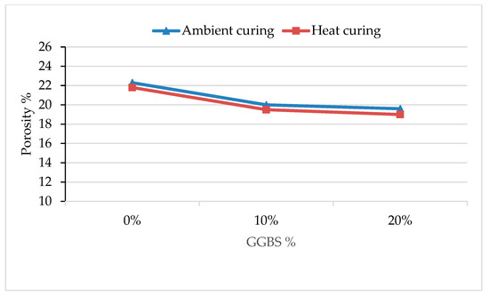 Figure 5 shows the porosity results at 28 days for the different geopolymer mortar mixes when they are exposed to ambient and heat curing. Porosity values decrease with the addition of GGBS for both ambient and heat curing, but heat curing delivers slightly less porosity. Porosity is inversely proportional to durability. This implies that the inclusion of GGBS increases the durability property of geopolymer mortar. From Figure 5 it can be noted that for ambient curing the mixes C90G10 and C80G20, respectively, deliver 10.3% and 10.5% less porosity than concerning control mix C100. Similarly, heat curing the mixes C90G10 and C80G20, respectively, results in 12.1% and 12.8% less porosity concerning control mix C100. If compared with conventional mortar made with cement, porosity values go up to 20% porosity with the addition of 60% CWP [21]. Considering the high water absorption of CWP in comparison to the cement, the porosity value increases for geopolymer mortar.