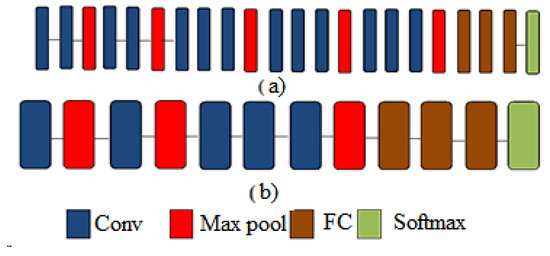 The architecture of VGG-16 and AlexNet models: (a) VGG-16 architecture and (b) AlexNet architecture.