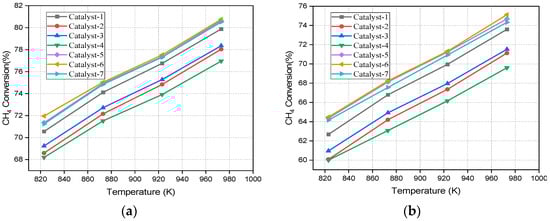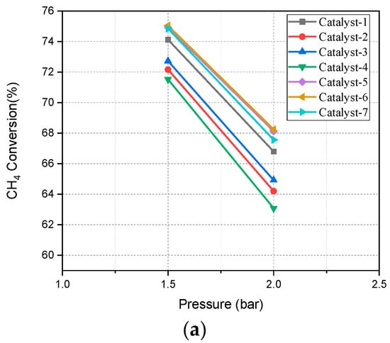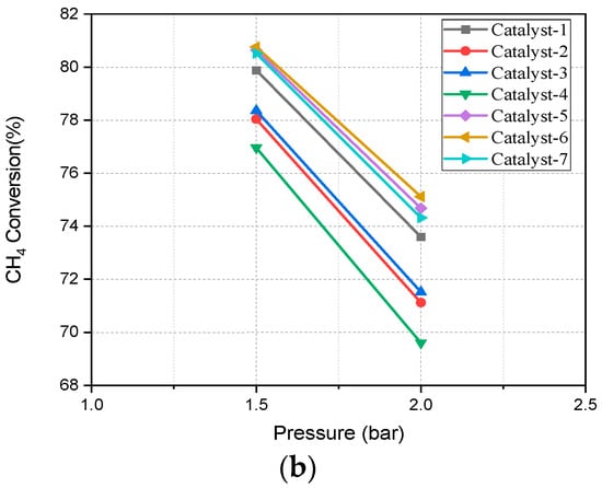 To understand the effect of the reactant’s pressure parameter on the CH4 conversion rates, the S/C ratio is constant at 3.0 during the reaction, and the pressure variations are plotted for the parameters against a constant temperature, as shown in the following, Figure 3a,b. From the plots, it can be inferred that for all the seven catalysts used for analysis, the conversion rates of CH4 go down as the pressure of reactants increases. This suggests that CH4 conversion is favoured at lower pressures for the set of catalysts considered in this work. In SMR reactions at higher pressures, the number of moles on the product side is more; this causes the equilibrium shift towards the reactants, resulting in reduced CH4 conversion.