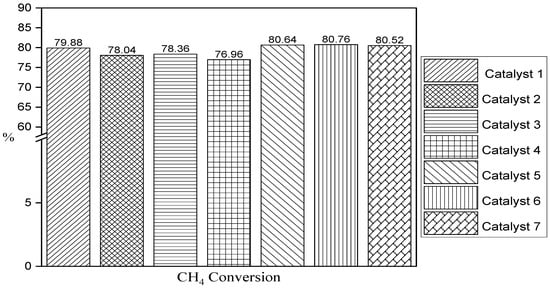 In Figure 4 the conversions of CH4 to H2 at the reformer exit of different sets of catalysts (catalysts 1–7) are forecasted under the operating conditions of 823 K, 1.5 bar, and S/C of 3.0 for an adiabatic reactor. A simulation with catalyst 6, which is 10.34 wt% Ni/Al2O3, generates the highest CH4 conversions of 71.96% and 43.95 at 823 K and 1.5 bar pressure due to its fast kinetics. The energy for activation to generate syngas using catalyst 6 is low, and thus the rate constant value is high. Therefore, the rate of s of CH4 selectivity and conversion to H2 is considerably higher for catalyst 6 compared to the other catalysts used in the current work. Catalyst 4 shows the lowest CH4 conversion (68.2 %), with operating conditions of 823 K, 1.5 bar, and S/C of 3.0 compared to the other catalysts. Considering the following order of catalyst activity in terms of CH4 conversion, Catalyst 6 > Catalyst 5 > Catalyst 7 > Catalyst 1 > Catalyst 3 > Catalyst 2 > Catalyst 4 for optimum conversion. The SMR process is an extremely endothermic reaction that requires the reactor to be operated under adiabatic conditions.