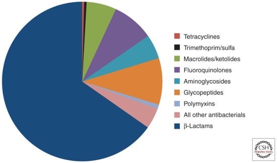 Antimicrobial resistance (AMR) refers to the ability of bacteria and fungi to withstand the effects of medications designed to eliminate them. This phenomenon occurs when these pathogens adapt and become resistant to drugs. Treating infections caused by resistant microorganisms becomes difficult and sometimes even impossible [,,]. In 2019, 1.27 million deaths were directly attributable to resistance. Six pathogens were each responsible for more than 250,000 deaths associated with AMR: E. coli, Staphylococcus aureus, K. pneumoniae, S. pneumoniae, Acinetobacter baumannii, and Pseudomonas aeruginosa, by order of number of deaths. Five regions had all-age death rates associated with bacterial AMR higher than 75 per 100,000: all four regions of sub-Saharan Africa and south Asia [,]. Figure 1 represents what antibiotics are currently in use and their share in the market. β-lactam antibiotics, such as penicillin and cephalosporins, are widely used in the field of antibiotics. As a result, the integrity of the bacterial cell wall is compromised, leading to cell lysis and ultimately bacterial death [].
