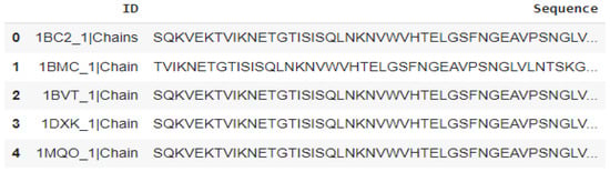 A comprehensive list of all β-lactamases is found in the β-Lactamase database [] “BLDB is a database that compiles sequence information as well as biochemical and structural information on all the currently known β-lactamases” []. The third column of that database was retrieved into a csv file. This csv file was fed into the downloads page of RCSB PDB to obtain a single fasta file containing all the sequences []. The first column of the dataset refers to the pdb code of the β-lactamase and the second column contains the protein sequence. “Statistics (number of structures): Overall (1540); Class A (579); subClass B1 (364); subclass B2 (15); subclass B3 (97)”; []. Figure 2 shows the first row of the Class B dataset.